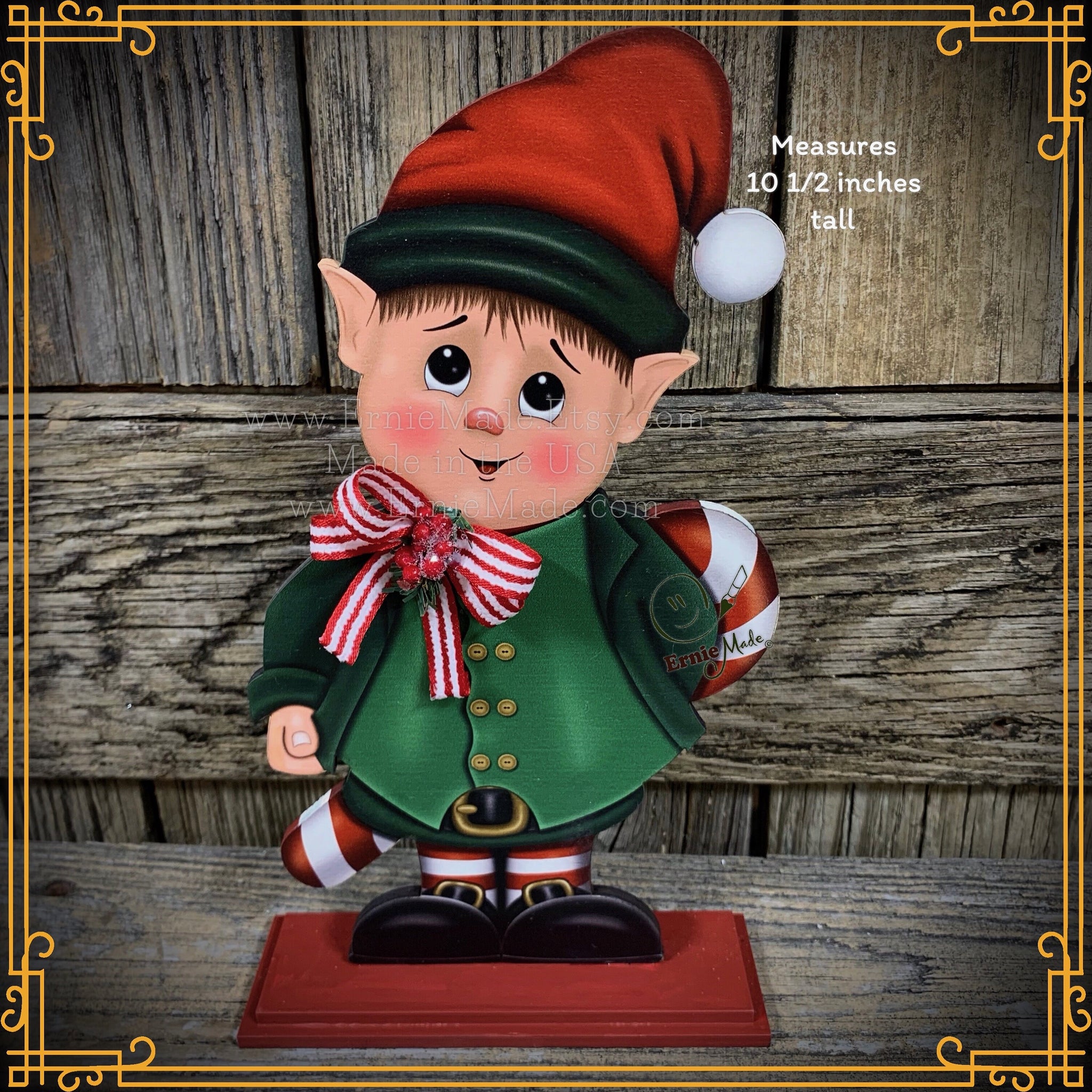 π The Elf is constructed of wood and has been varnished for protection. He is embellished with a coordinating ribbon, frosted berries and pine. Β