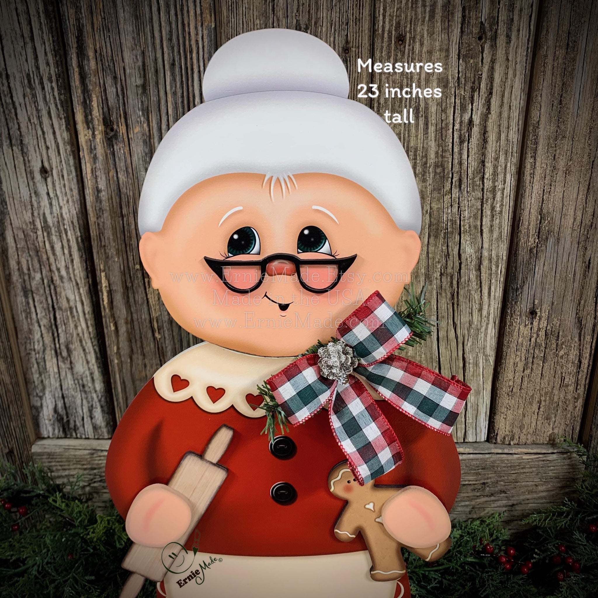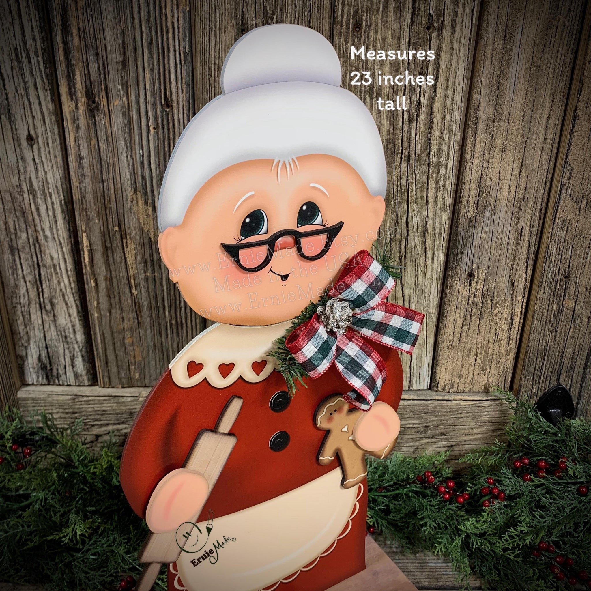 π Mrs. Clause is constructed of wood and has been embellished with glasses. She has many details including check Christmas bows, rolling pin, and Gingerbread cookie.