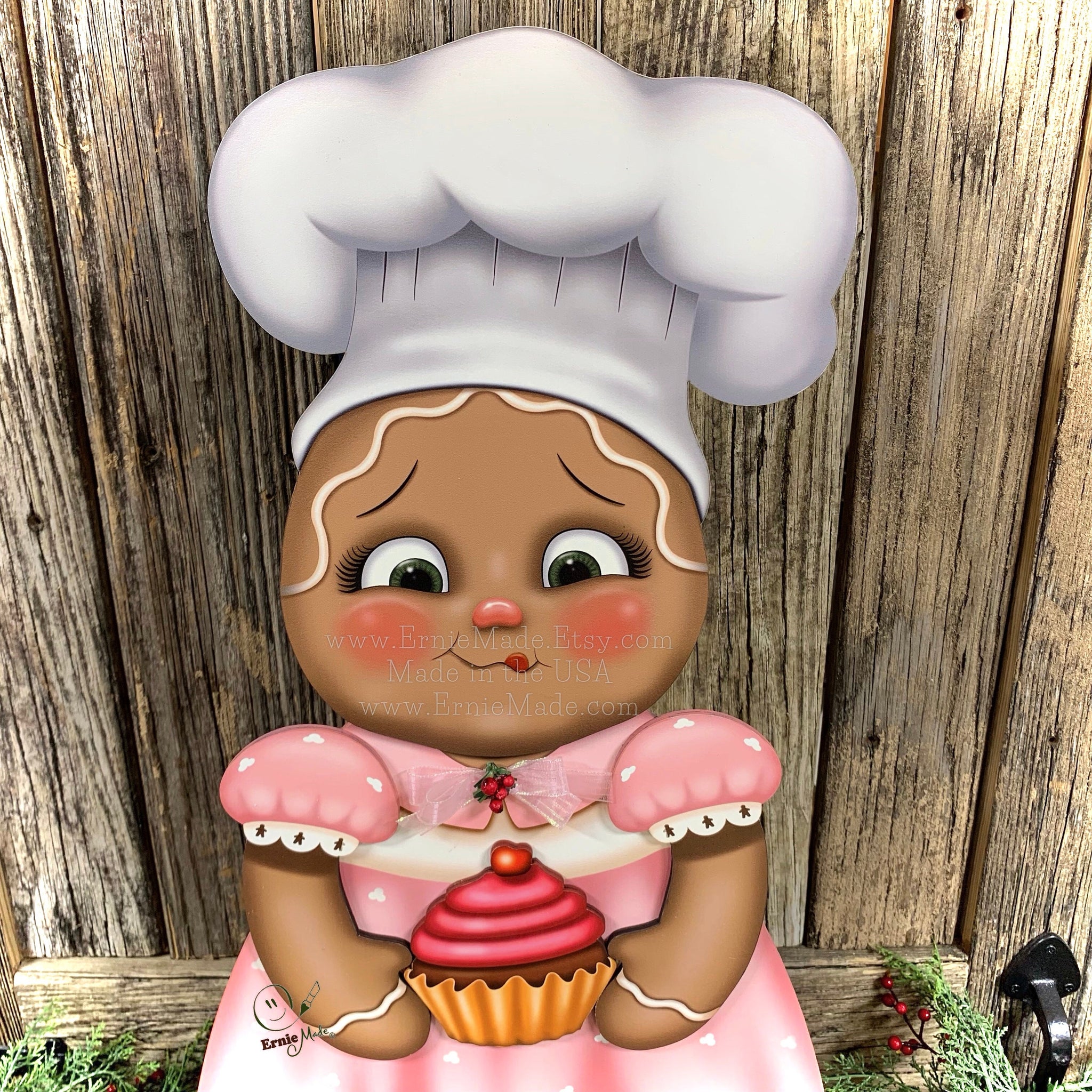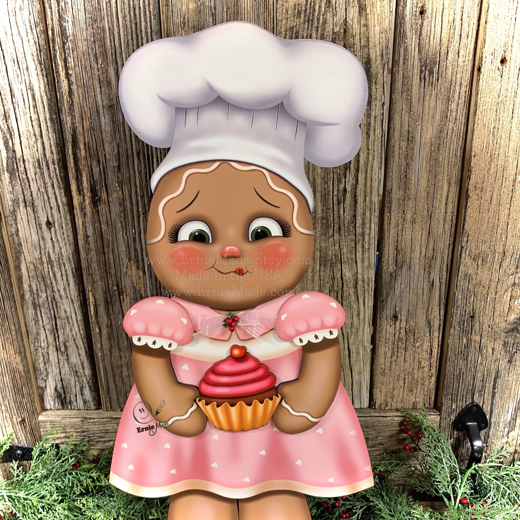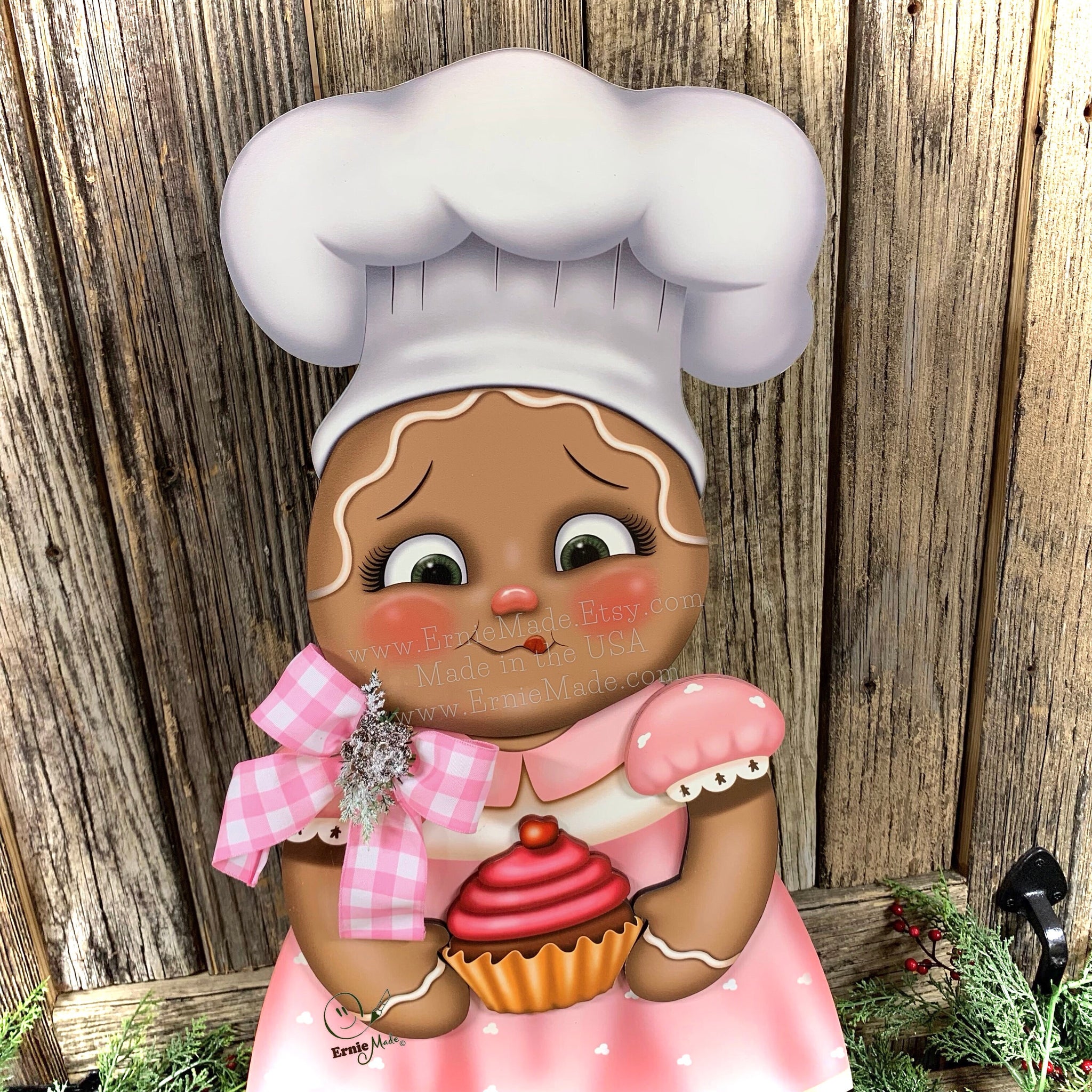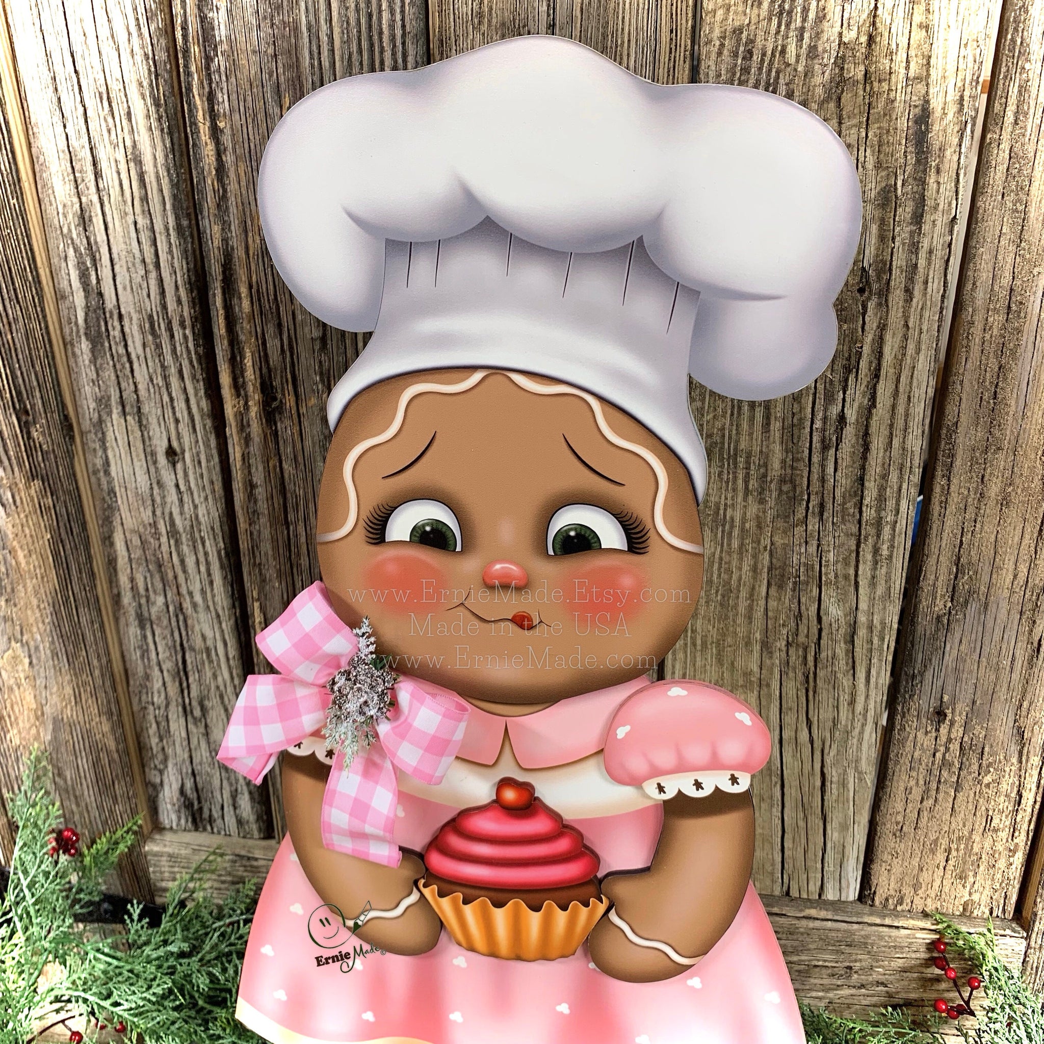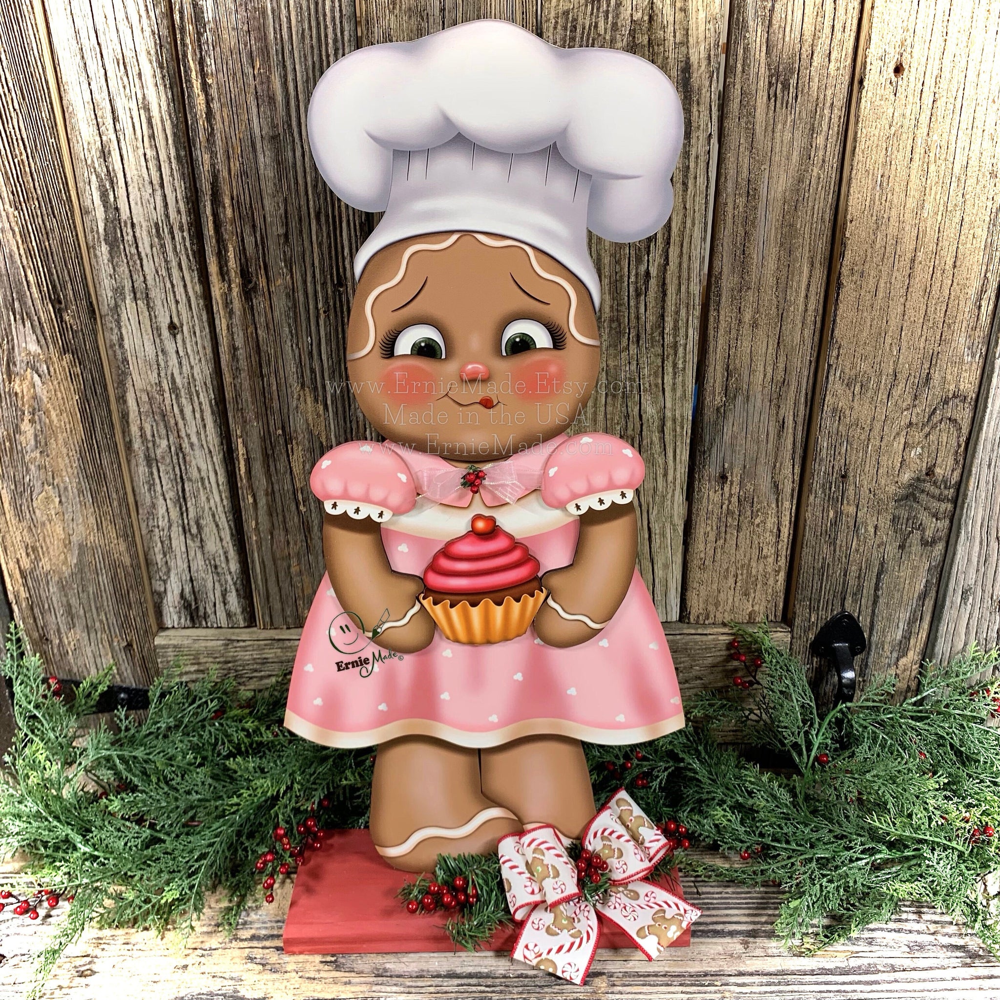 Wow your guests this Holiday Season with this Beautiful Large Gingerbread decoration! This Gingerbread cookie is so Adorable with her cute pink dress, chef hat and cupcake.