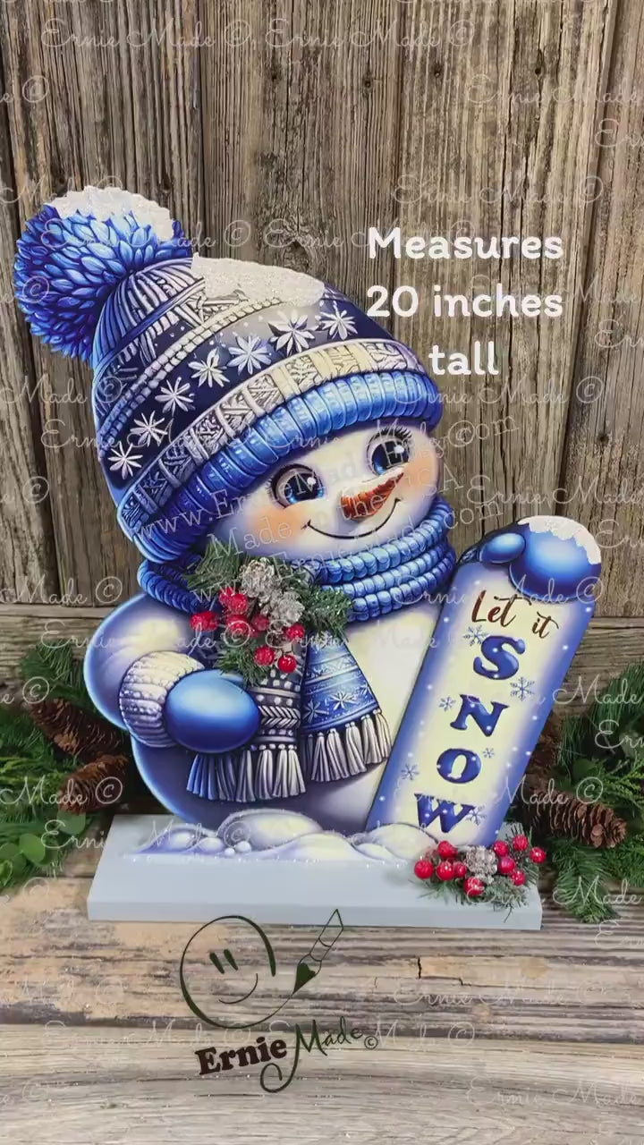 The Snowman is embellished with sparkly snow, berries and pine. His sign reads "Let it Snow"...The Snowman is constructed of wood and has been varnished for protection. The back of the design is painted black.