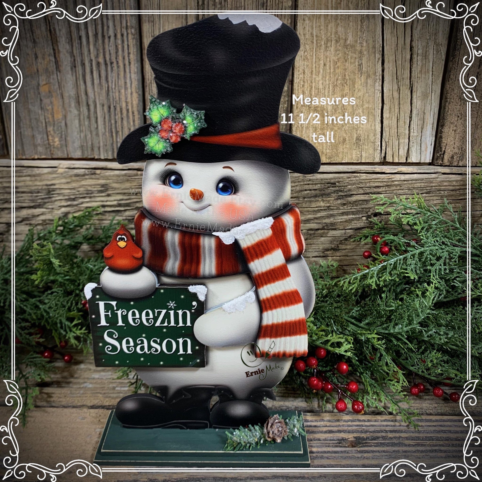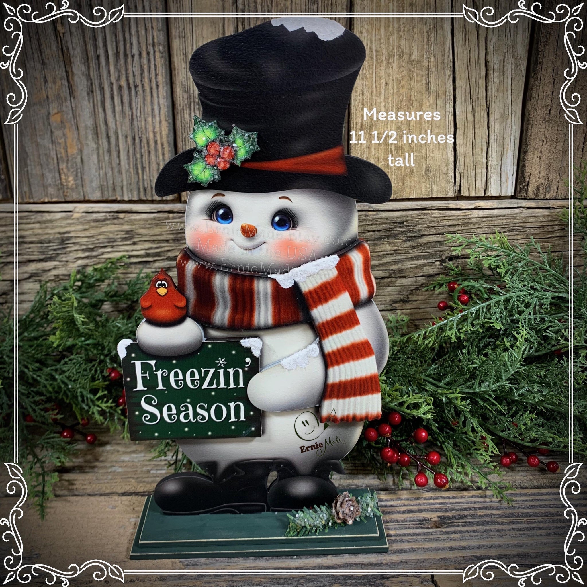 The Snowman is embellished with sparkly snow and a cute red Cardinal. There are two options available for the sign. The Snowman is constructed of wood and has been varnished for protection. The back of the design is painted black.