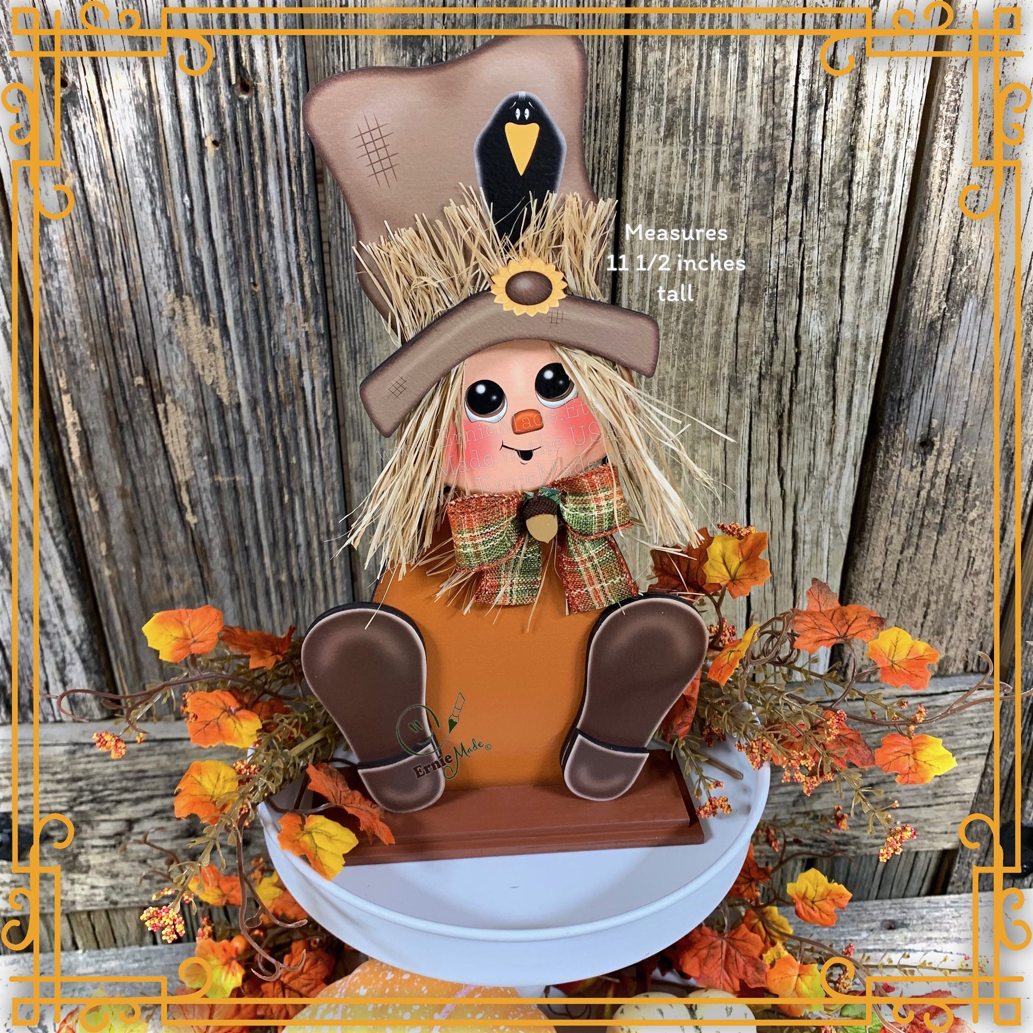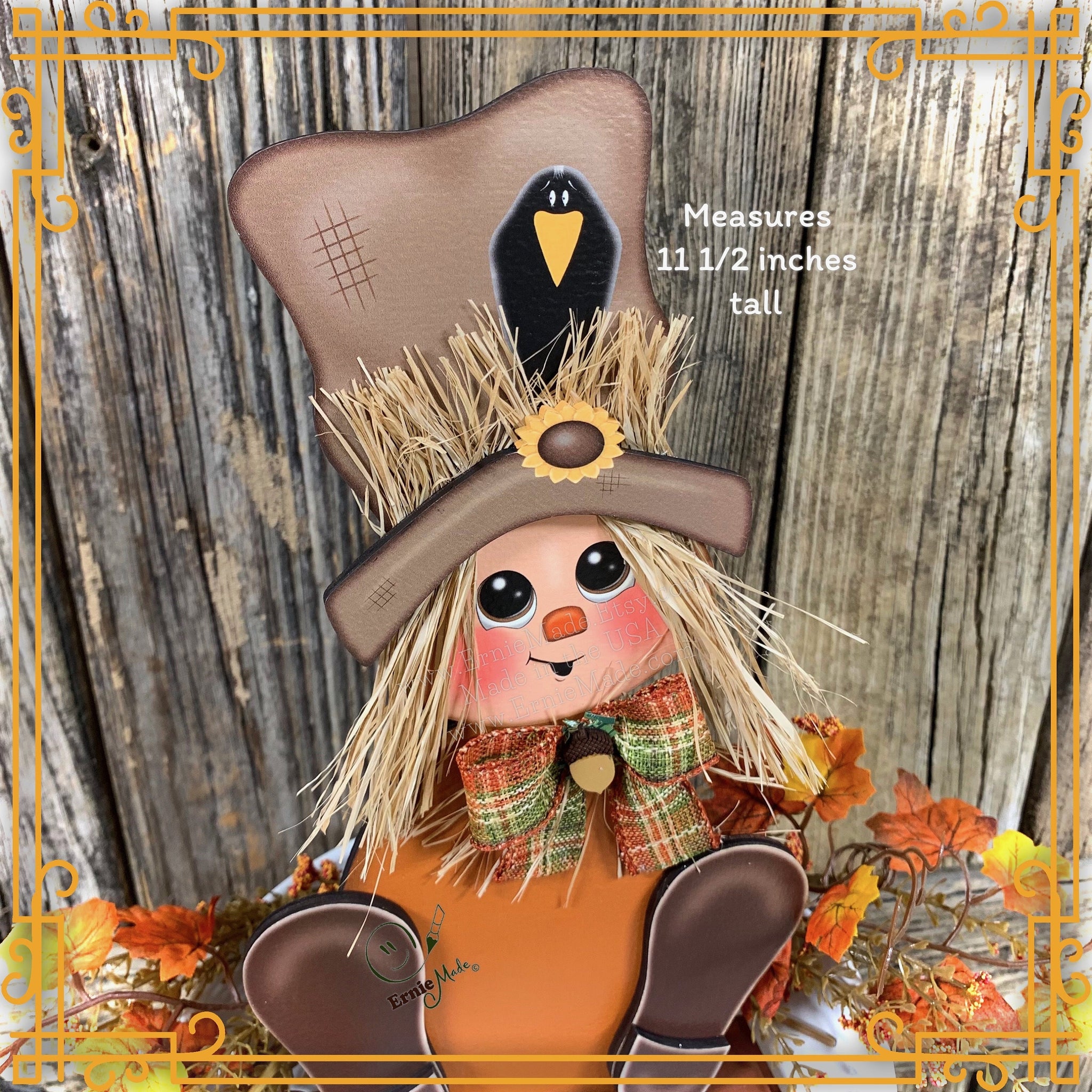 π The Scarecrow is constructed of wood and has been painted with a crow perched on the rim of his hat. He is adorned with Raffia and a coordinating ribbon. The bow is embellished with a tiny wooden acorn.