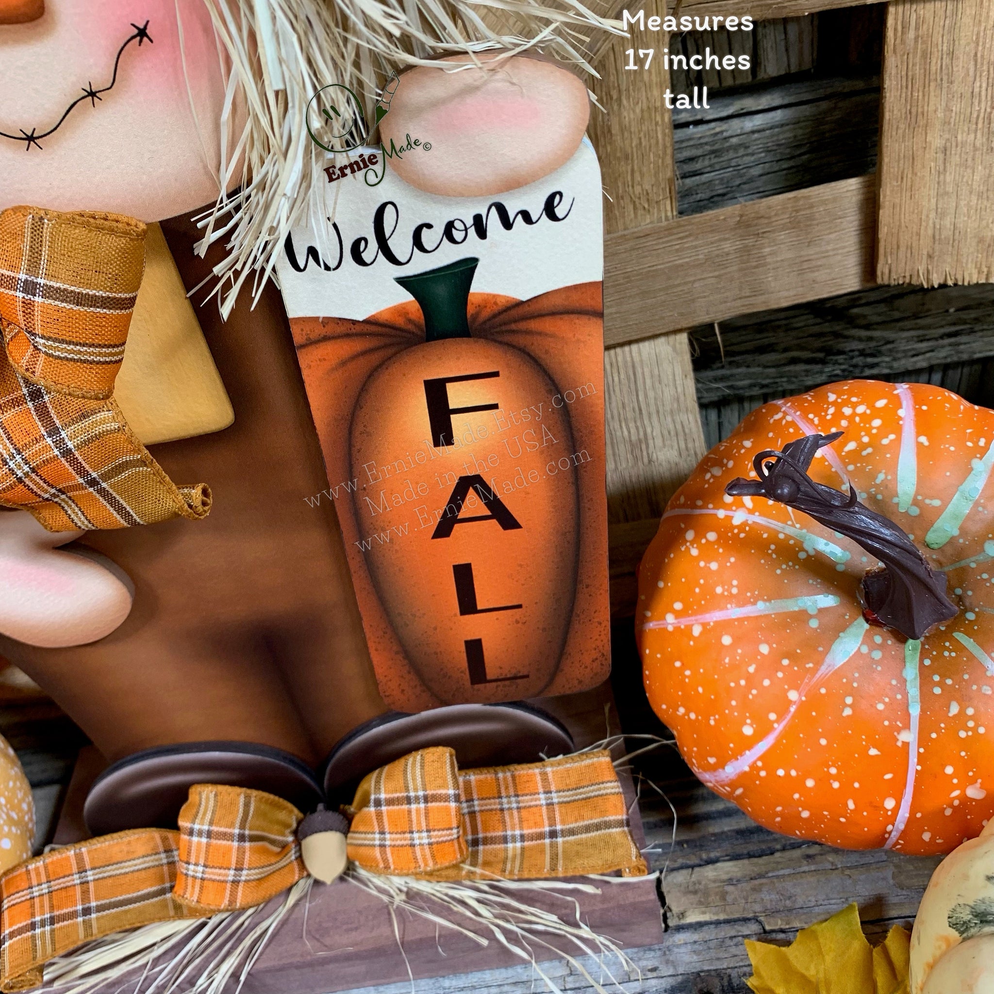 🧡 The Characters we design including this Scarecrow are unique to our shop. This Scarecrow is constructed of wood and varnished to preserve its beauty. This is a one-sided centerpiece The back of the design Is painted black.
