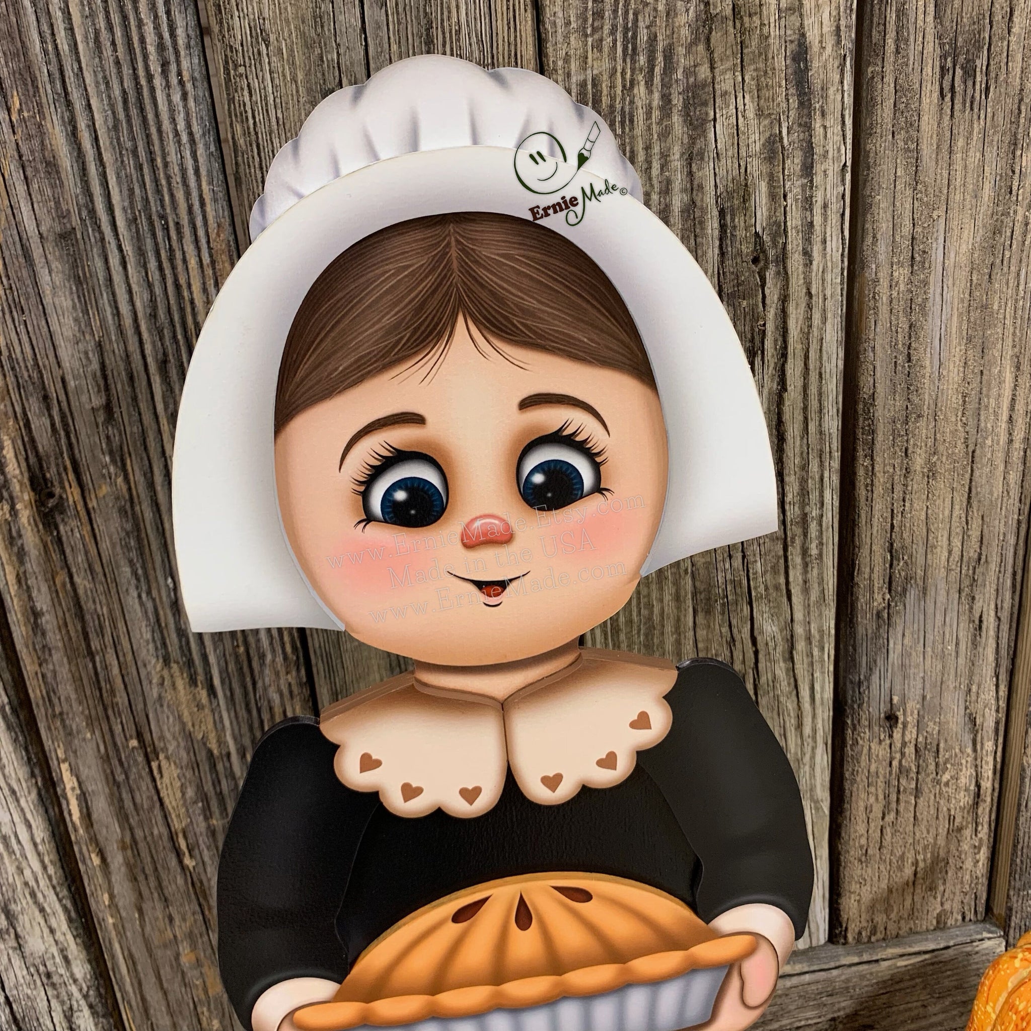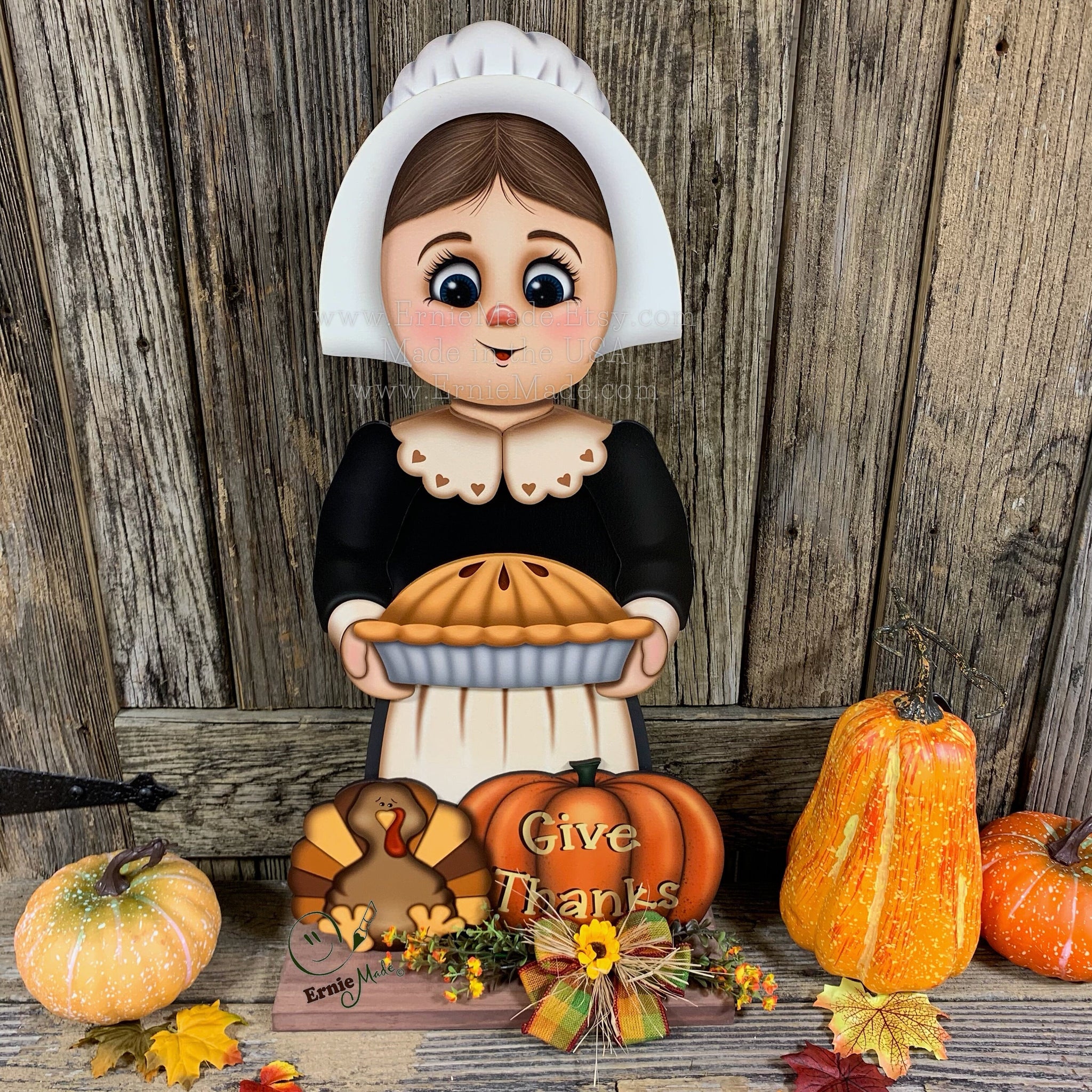 🧡 The characters we design are unique to our shop. The Pilgrim girl is constructed of Wood and has been varnished for protection. This is a one-sided centerpiece. The back of the piece is painted black.