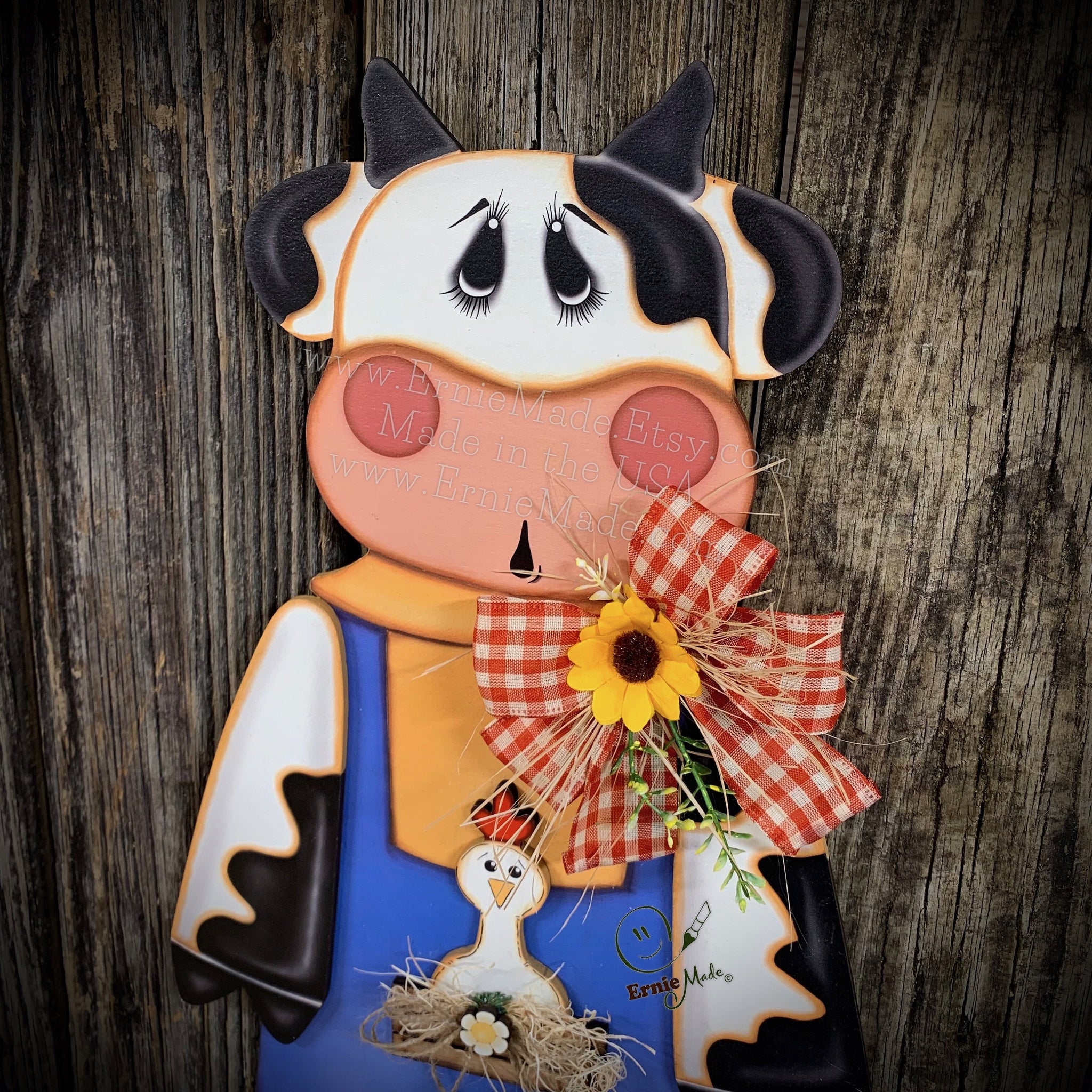 This whimsical cow door/wall hanger is the perfect touch for your Farmhouse decor. This unique cow would make a wonderful kitchen door hanger or can be added to a wreath as an embellishment.