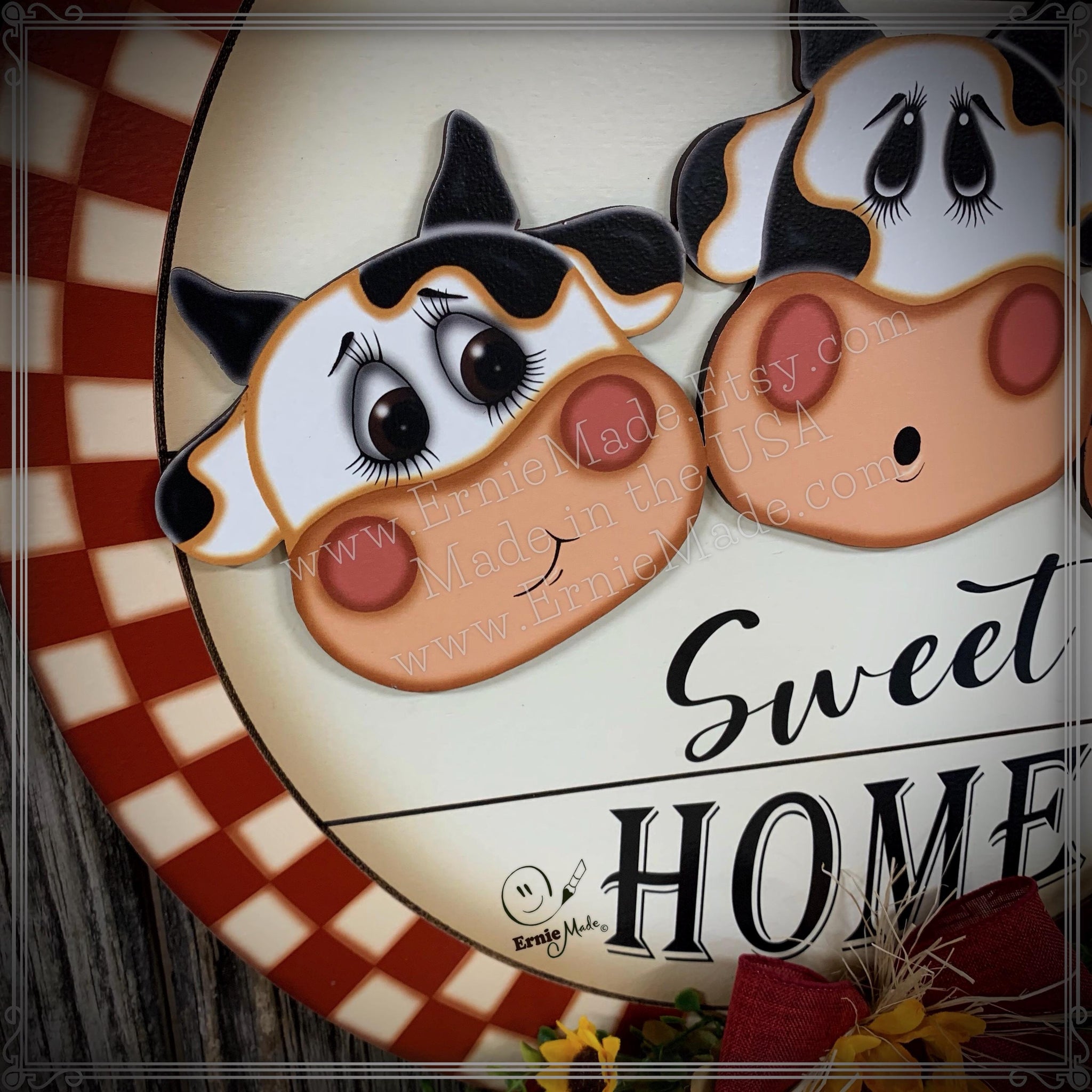 ♥️This fun door hanger comes with greenery embellished with Sunflowers, raffia and a coordinating red linen bow. Each cow has her own facial expression. This whimsical 3D door hanger can be displayed year-round. I recommend displaying on a door with a protective overhang or under a covered porch or patio.