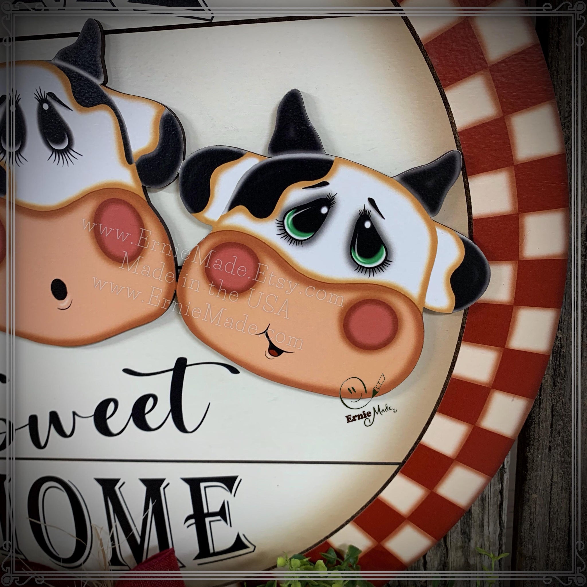 Welcome guests with this farmhouse inspired door hanger. The whimsical design features three black and white cows and reads "Home Sweet Home". Each cow has her own personality. The cows and the sign are constructed of wood.