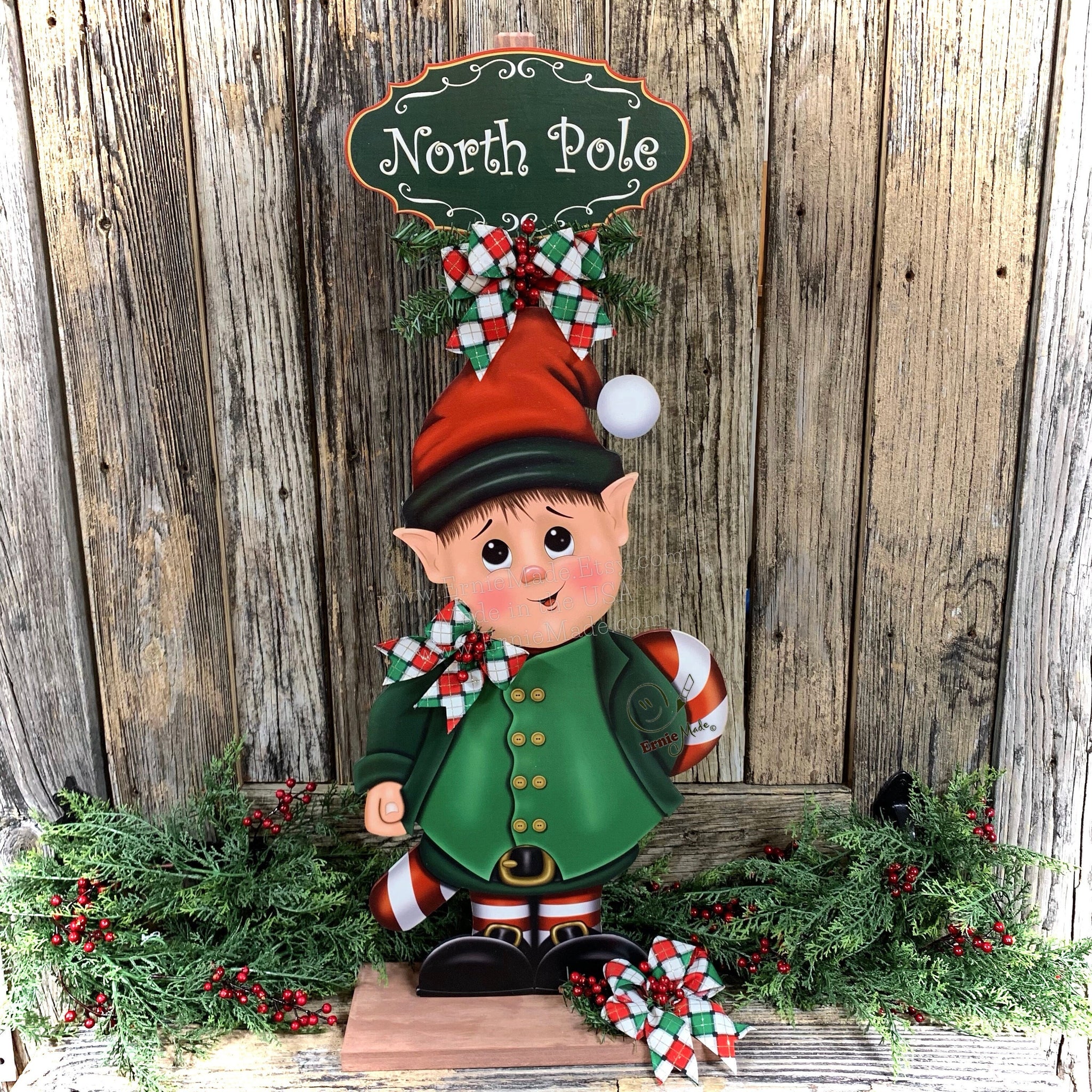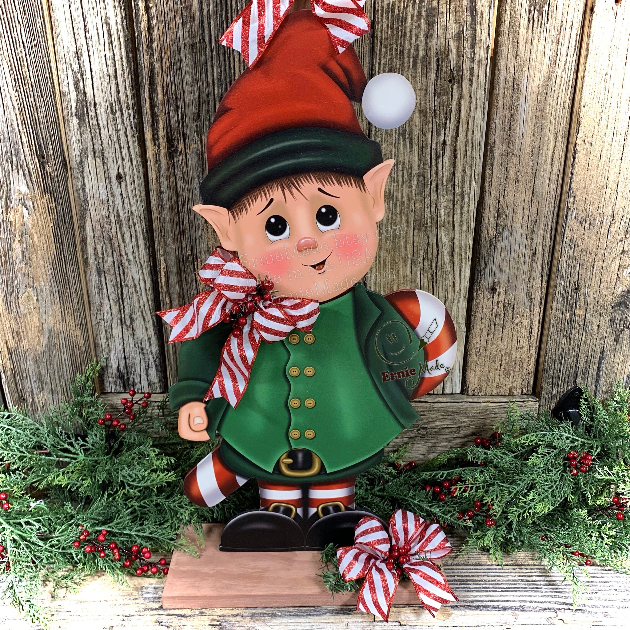 ♥️ This cute elf design can be displayed by a Christmas tree or perhaps an entry way. He can also be displayed on a porch or patio, but I recommend under a roof or protective overhang.