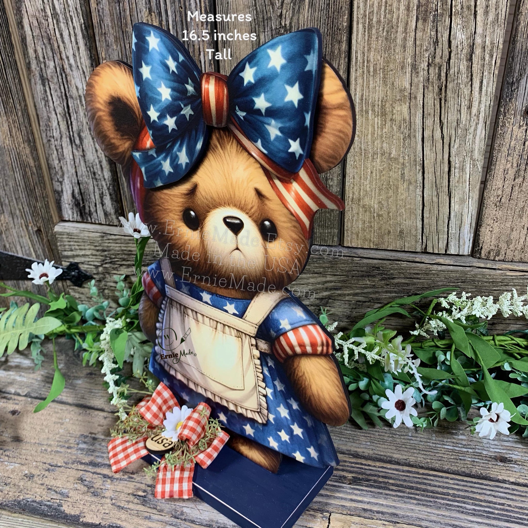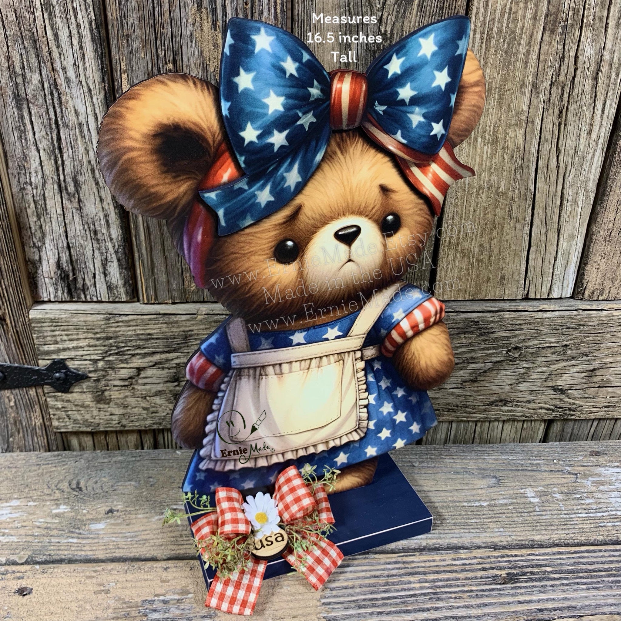 The cute bear features a patriotic dress with a huge bow on her head adding to her whimsical character. The design is accented with coordinating ribbon at the base. The Bear and base are made of wood. The decoration comes ready to display (no assembly required). This is a one-sided design. the back of the design is painted black.