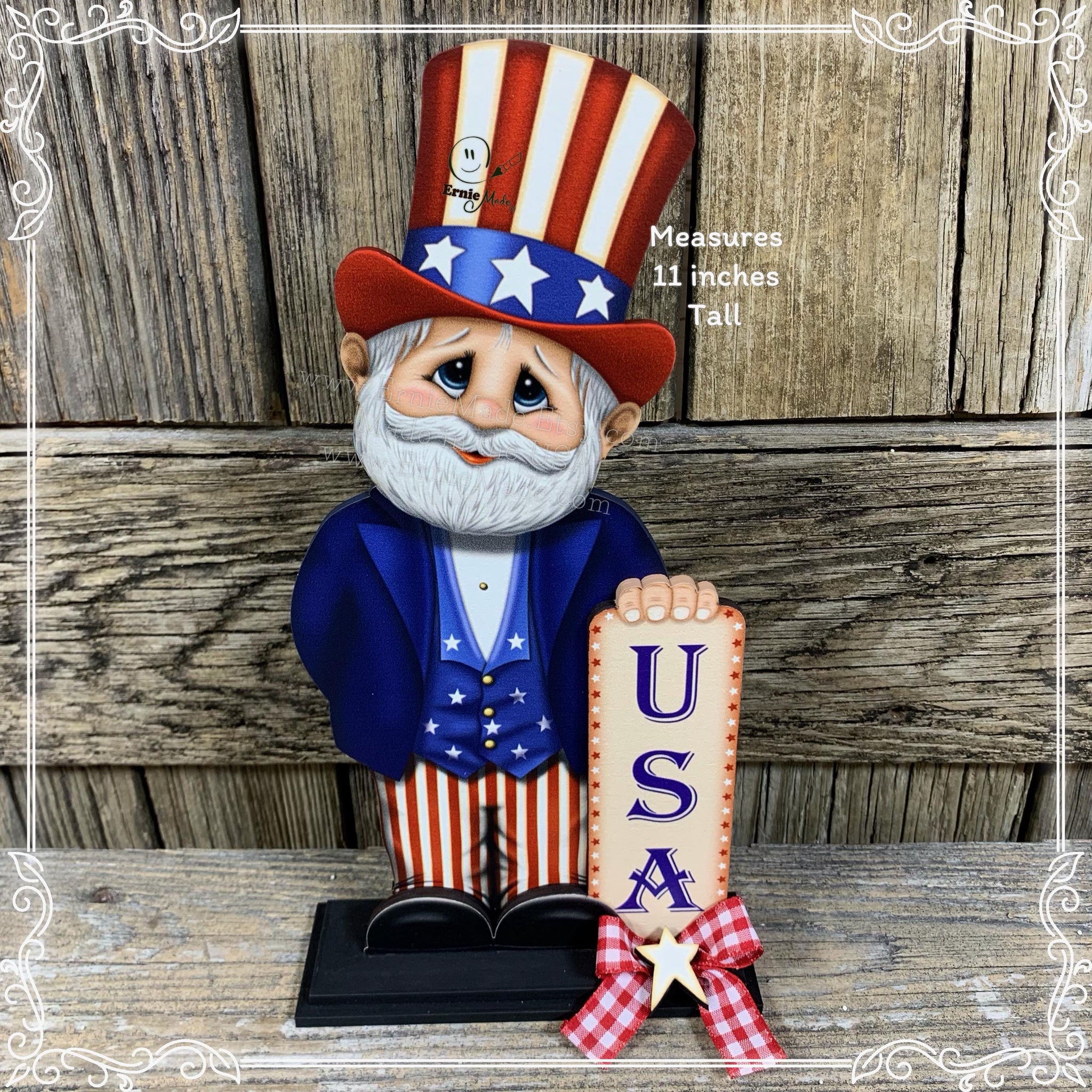 Welcome the Summer holidays with this cute little Uncle Sam design. He is a smaller version of our larger designs (listed separately) This whimsical Uncle Sam design can be displayed on a tiered tray, tabletop, or used a shelf sitter.