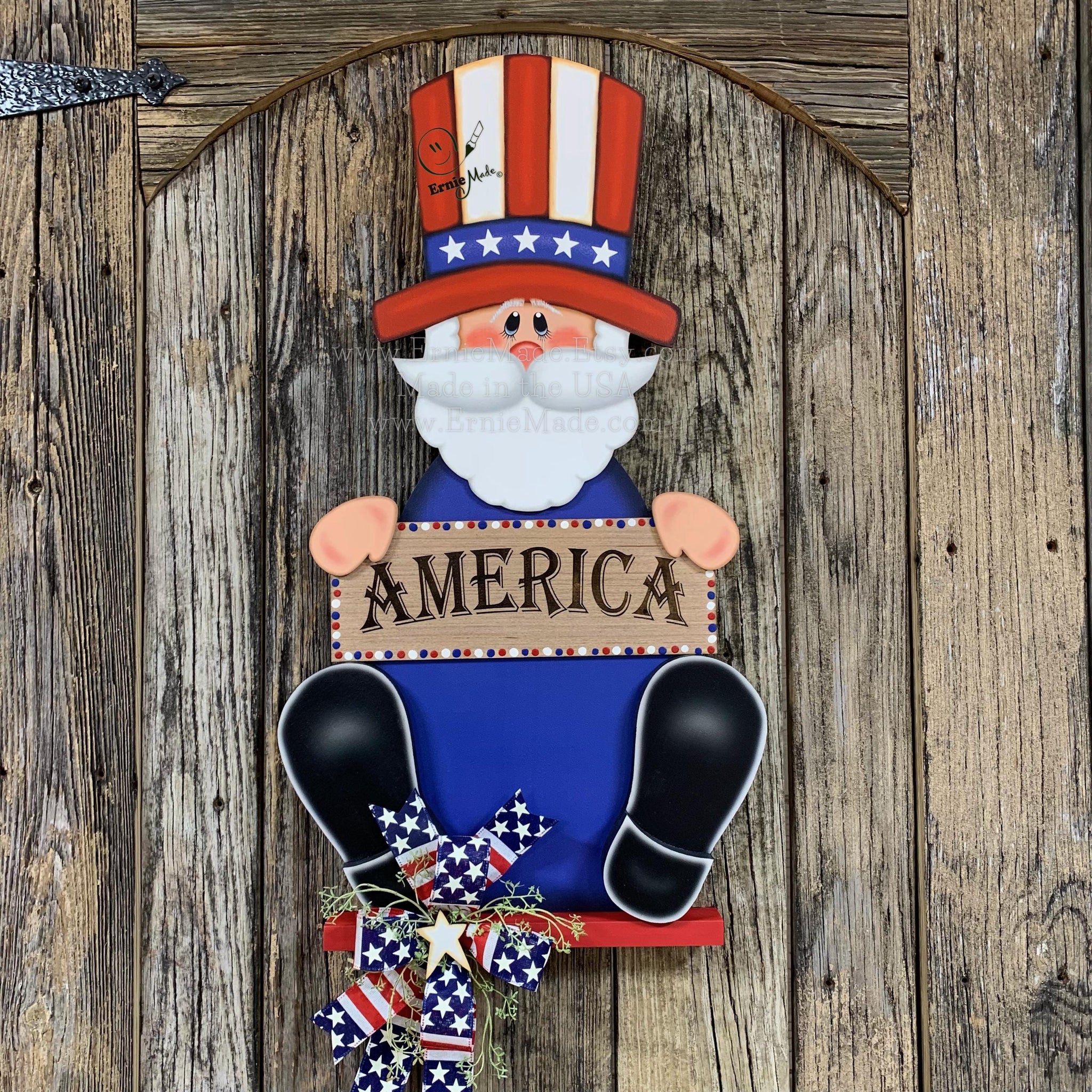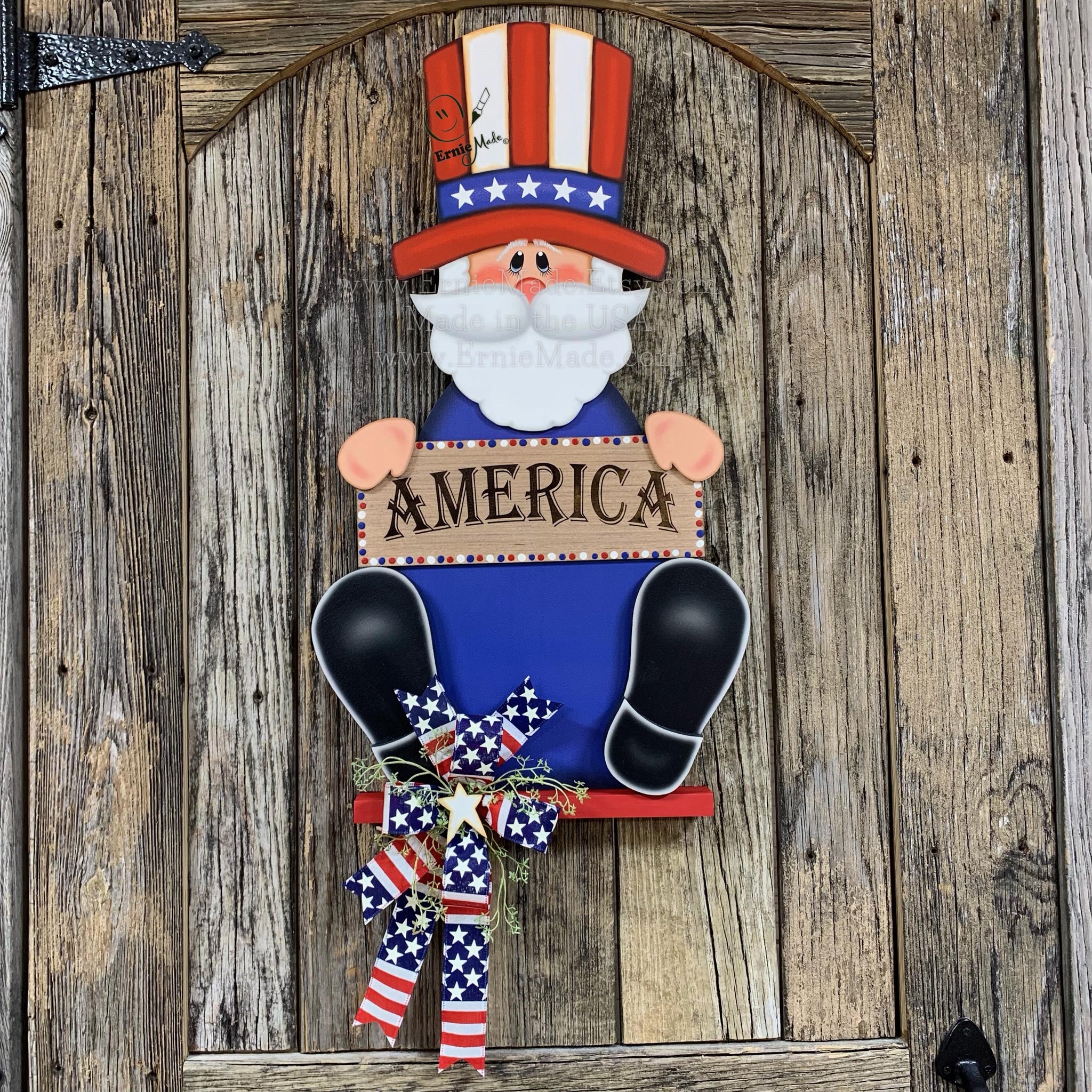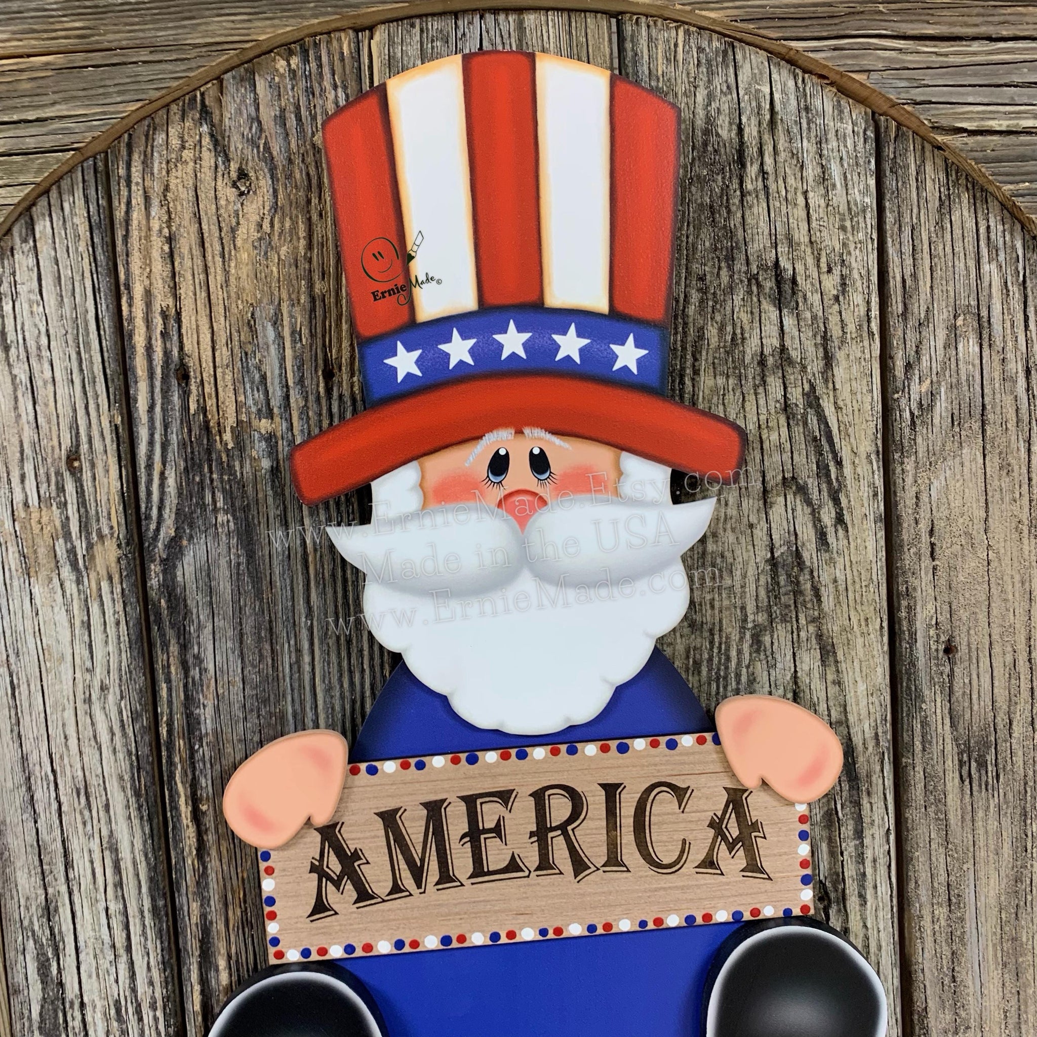 🇺🇸 The Uncle Sam Design is constructed of wood and has been sealed for protection. The Uncle Sam features an option for the engraved sign that reads “America” or "Happy 4th of July"