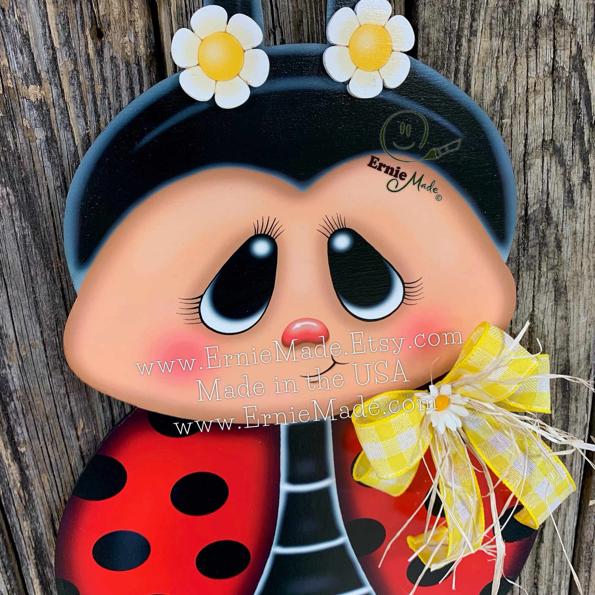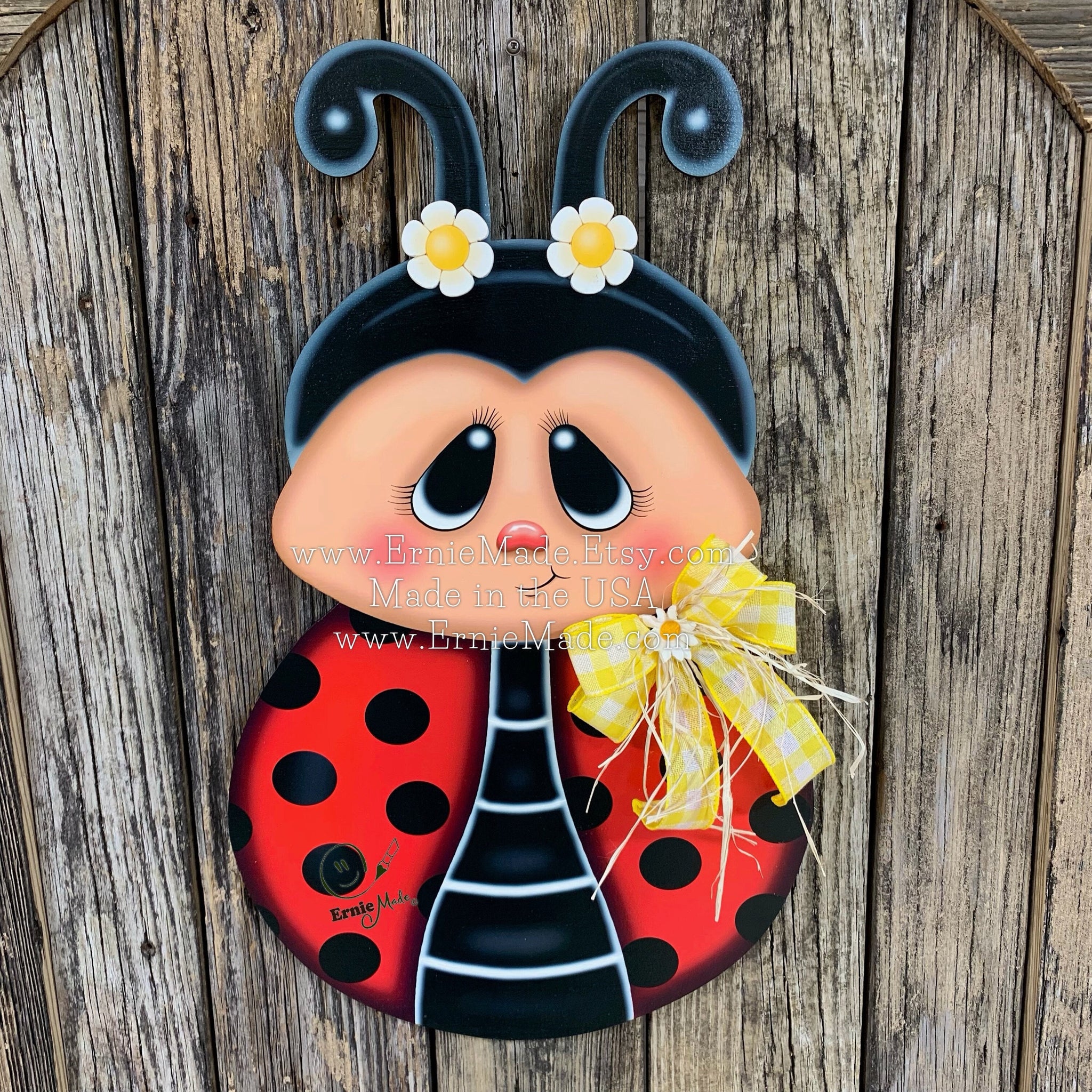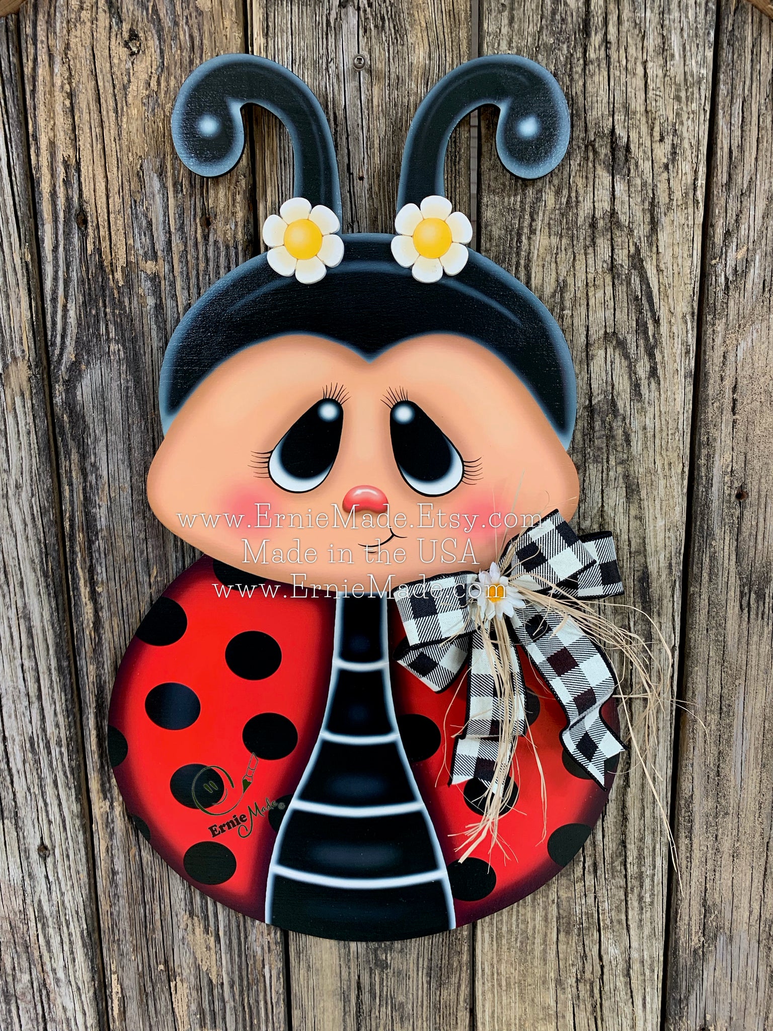 🌼 The Ladybug is constructed of wood and has been sealed for protection. This Wooden Ladybug door hanger is embellished with a bow (there are three ribbon options to choose from). See listing photos for samples of ribbon options.