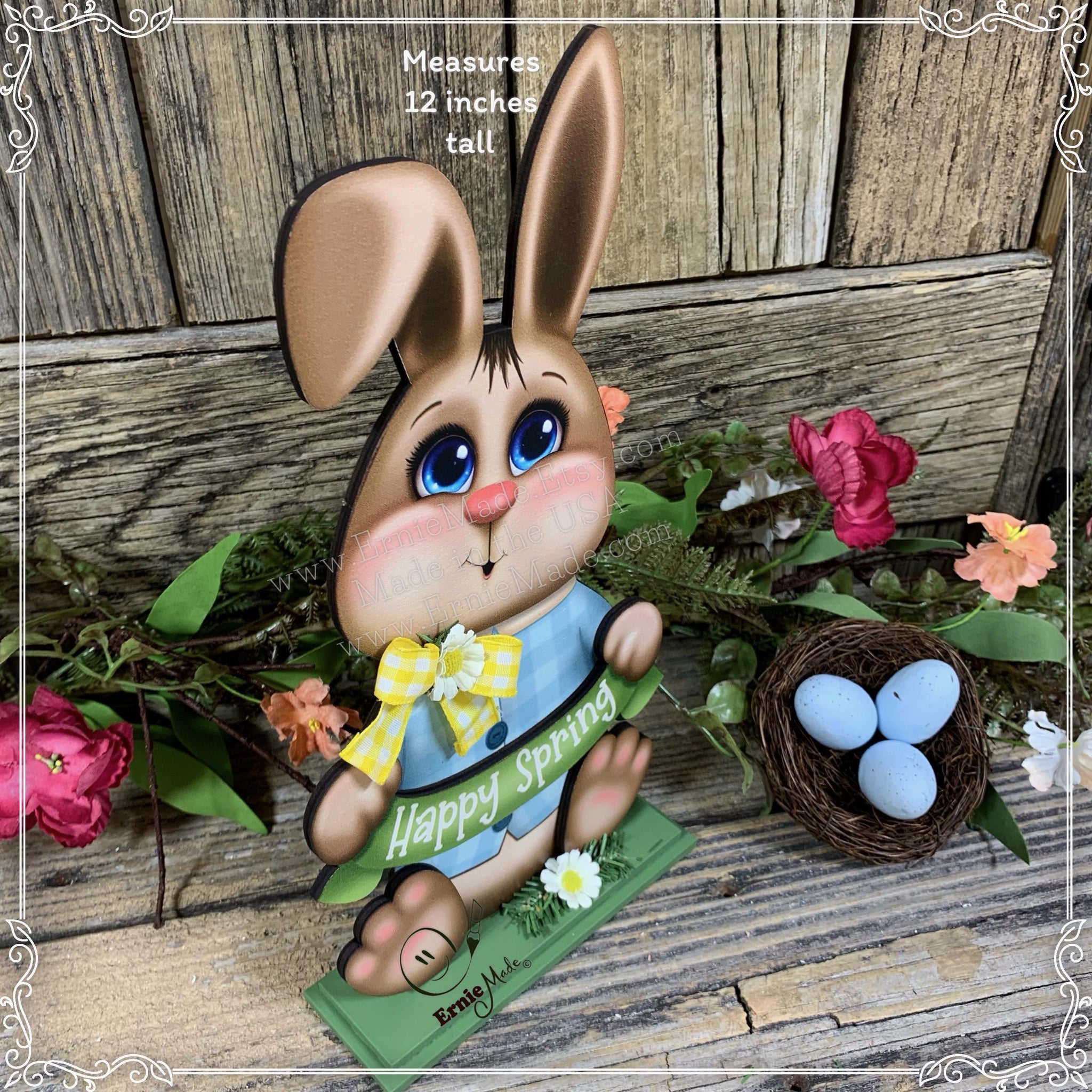 🌸 The Bunny design is constructed of wood and has been varnished for protection. The Bunny is holding a banner with your choice of either “Happy Spring” or “Happy Easter.” The Bunny will come fully assembled and ready to display. This is a one-sided design the back of the bunny is painted black.