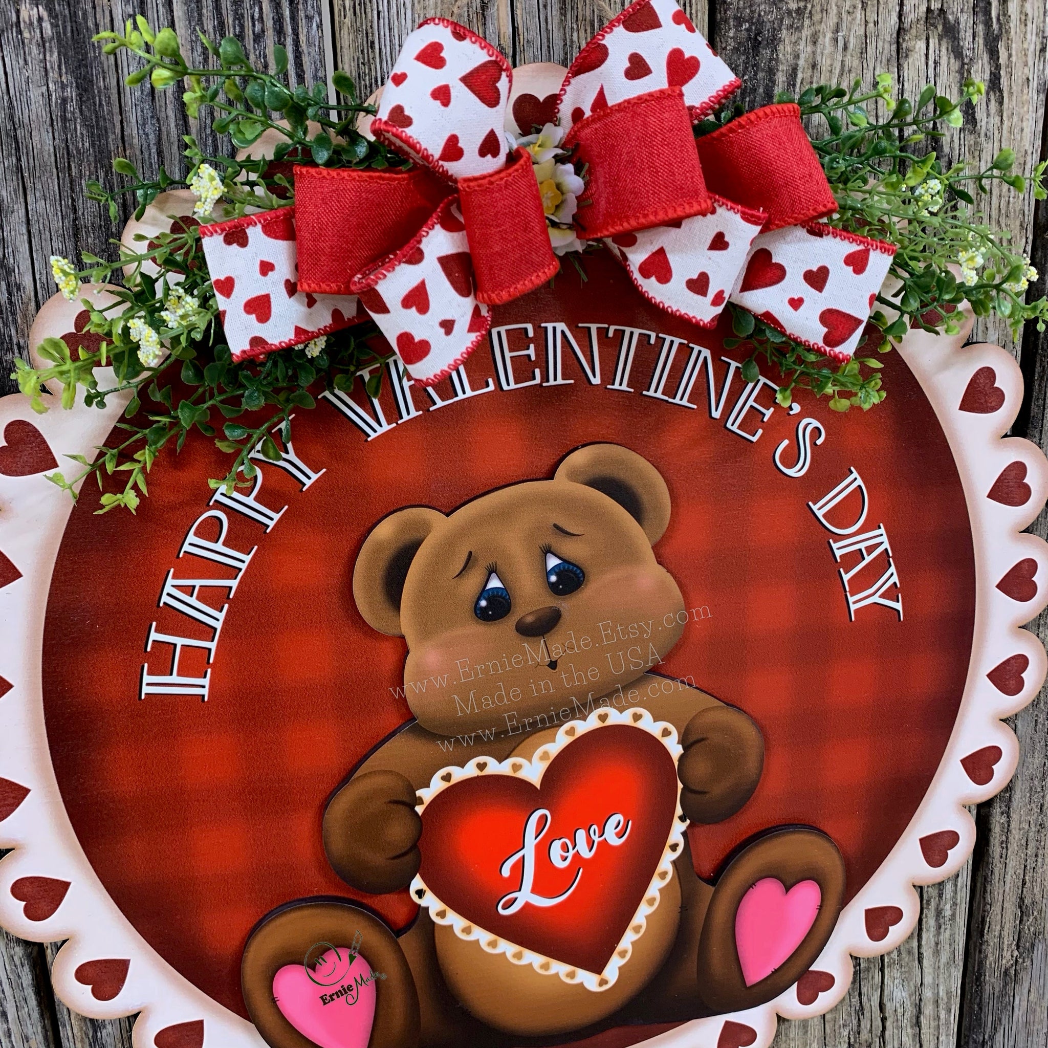 ♥️ The painted sign is embellished with a scalloped edge with hearts. The sign reads "Happy Valentine’s Day". The sign and bear are constructed of wood and are varnished for protection.