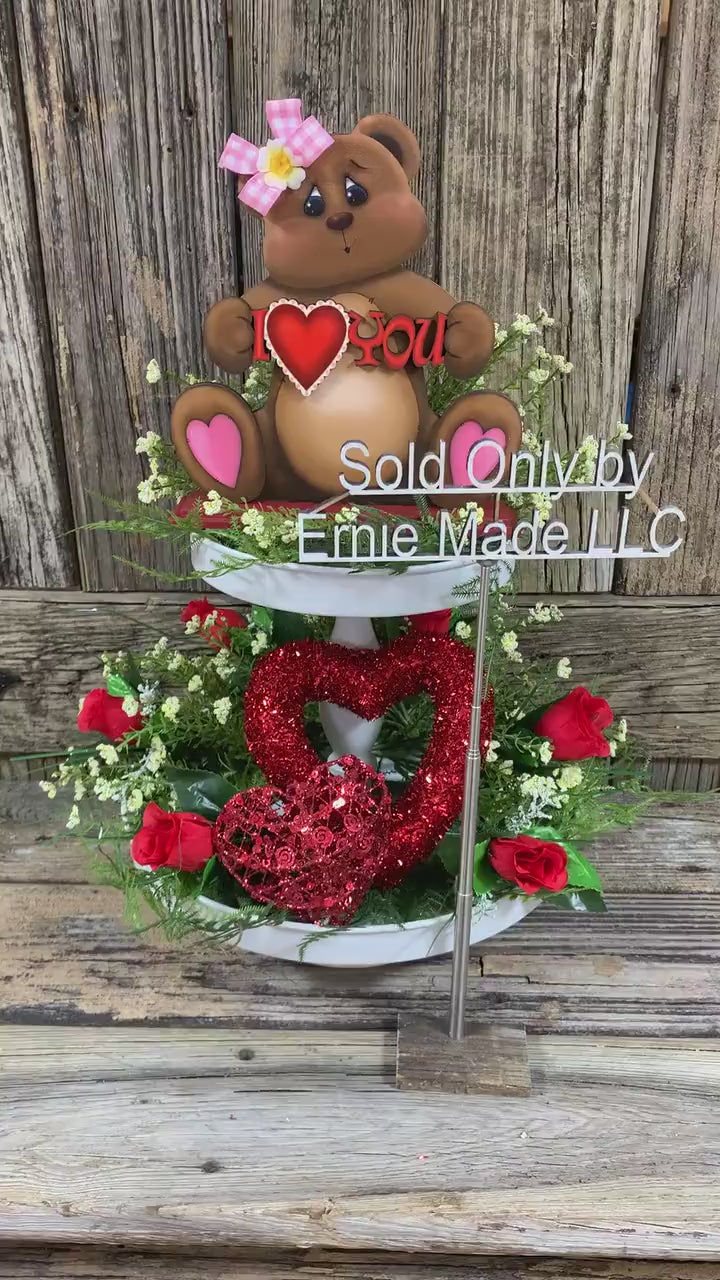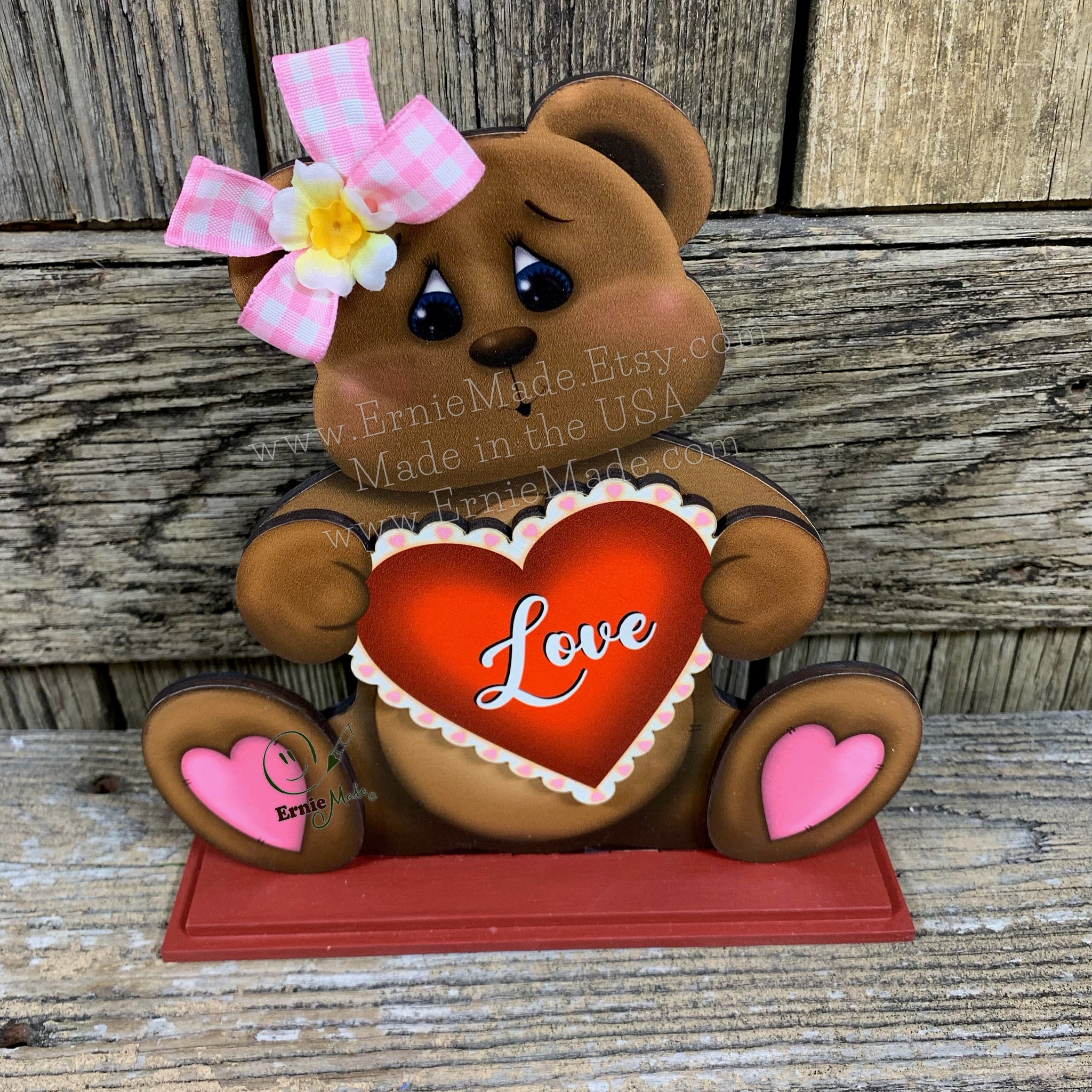 The Wooden Teddy Bear is embellished with a bow and comes in three different styles (see listing pictures for variations) There is one with the words "I Love you" one holding a heart that reads "Love" and one holding a heart that reads "Be my Valentine". The Valentine Bear is constructed of wood and has been varnished for protection. The back of the design is painted black.