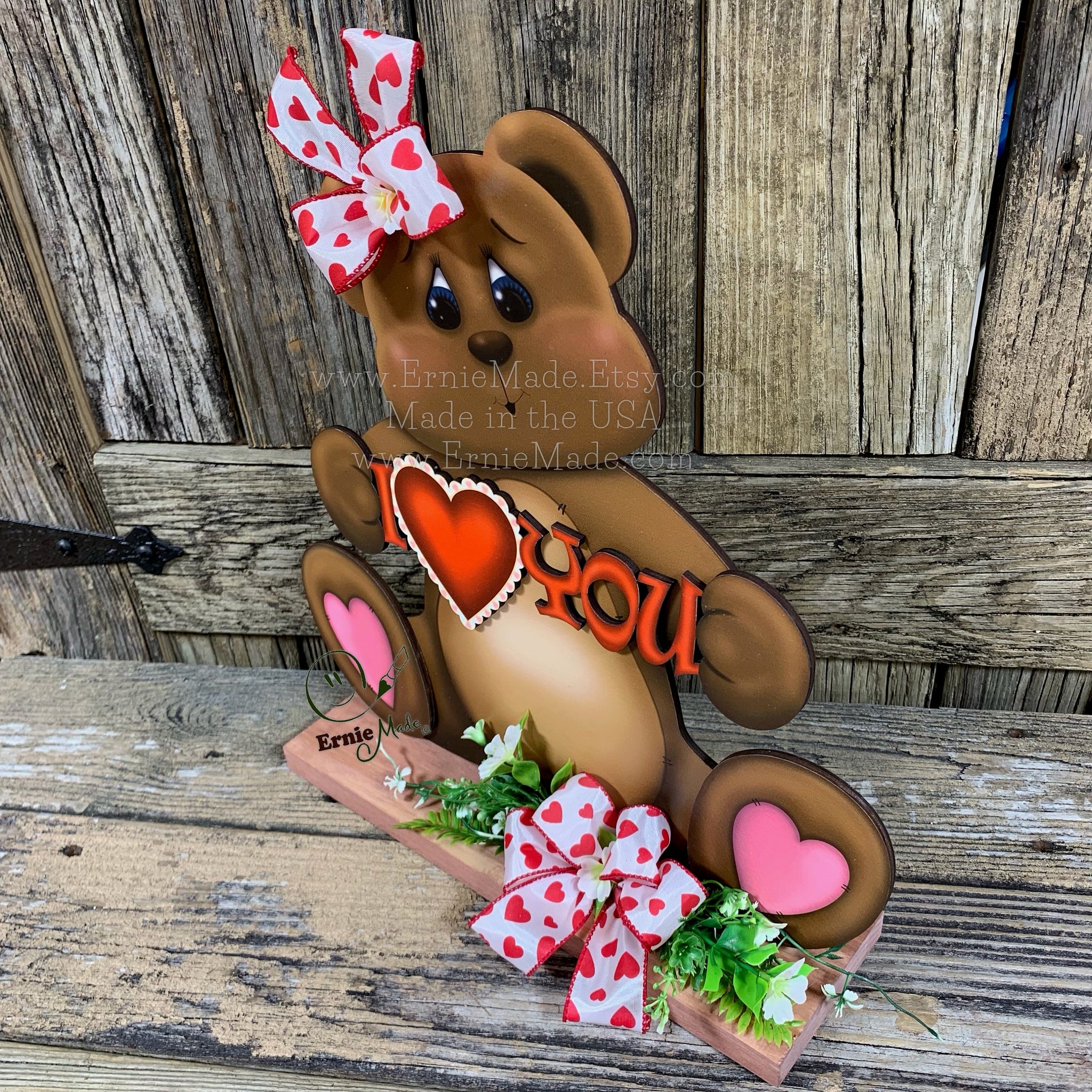 The Wooden Teddy Bear is embellished with two bows and comes in three different styles (see listing pictures for variations) There is one with the words "I ❤️ you", one holding a heart that reads "Love" and one holding a heart that reads "Be my Valentine". The Valentine Bear is constructed of wood and has been varnished for protection. The back of the design is painted black.